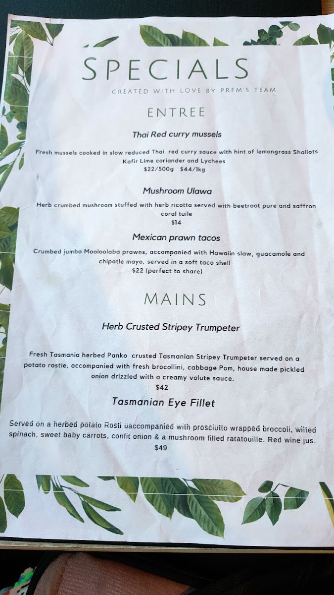 Welcome to Prem's Seafood Bar & Grill, a gem nestled in Devonport, Tasmania. This vibrant restaurant offers a delightful culinary journey that centers around fresh, expertly prepared seafood and succulent chicken dishes. The menu showcases an array of choices, including the daily fish & chips and the indulgent Tasmanian Blue Eyed Trevalla, celebrated for its creamy white wine sauce. For land lovers, the Chicken Parmigiana and the Rooke Street Chicken promise to tantalize your taste buds with rich flavors.