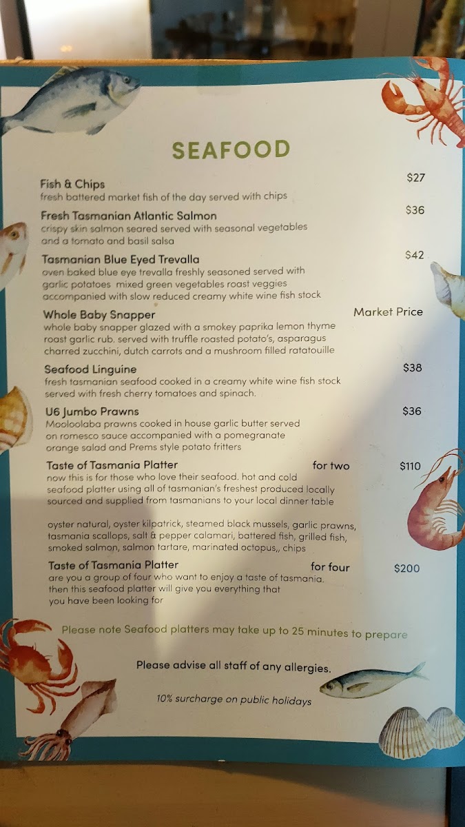 For Two now this is for those who love their seafood. hot and cold seafood platter using all of Tasmanian’s freshest produced locally sourced and supplied from Tasmanians to your local dinner table oyster natural, oyster kilpatrick, steamed black mussels, garlic prawns, tasmania scallops, salt & pepper calamari, battered fish, grilled fish, smoked salmon, salmon tartare, marinated octopus, mediterranean vegetable paella, chips